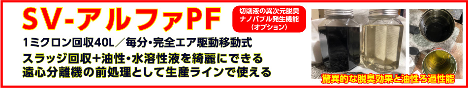 革新的キレイな切削液で加工してみませんか➡SVアルファPFで加工性能UP「汚れた切削液をキレイにする」➡実績NO.1放電加工の電極に付着するぬめり軽減➡電極の減り改善➡0.5ミクロン回収SVアルファPF「液中スラッジ目視ゼロ」:自動脱水スラッジ回収装置NO.1ブランドへ➡鋳物ヘドロを手を汚さず自動回収・水溶性・油性も任せて「回収目的と予算で選べる浮上油自動回収装置~マルチ高性能スラッジ回収装置」➡再生型多段式スラッジ回収装置⇔「磁性体研磨・鋳物ヘドロ自動脱水➡SVαMAGで産廃費軽減」➡「浮上油とスラッジ回収装置の特許開発専門メーカー」➡❶チョコ停対策【センタースルーに効果発揮】❷地下水・用水路・水道水で使えるウルトラファインバブル特許が凄い切削・研磨・洗浄機・ハウス栽培に大幅節水【スラッジ目視ゼロ切削液をキレイにSVアルファPFココタップ➡比較写真】➡脱臭と清浄効果➡「切削液悪臭ゼロを目指す」❸SV-EMM➡一台で浮上油回収+スラッジ回収【液面と沈殿スラッジ回収装置SV‐101】東日本と西日本に拠点スピード対応➡